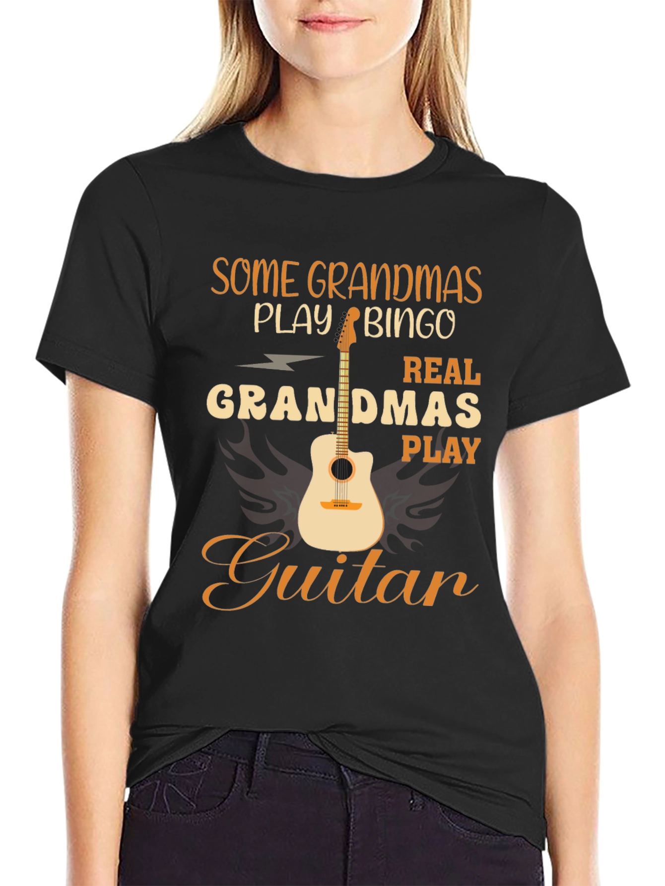 Show off your love for music with this unique t-shirt! This black tee features the fun saying, "Some Grandmas Play Bingo, Real Grandmas Play Guitar", alongside a graphic of an acoustic guitar. The text is printed in a stand-out golden brown font. Made from comfortable and breathable fabric, this t-shirt is perfect for casual wear or a night out with friends. It's a great gift for guitar-playing grandmothers who want to express their passion and stand out from the crowd. Wear your love for music proudly with this stylish and expressive t-shirt. Add a touch of rock-and-roll spirit to your wardrobe!